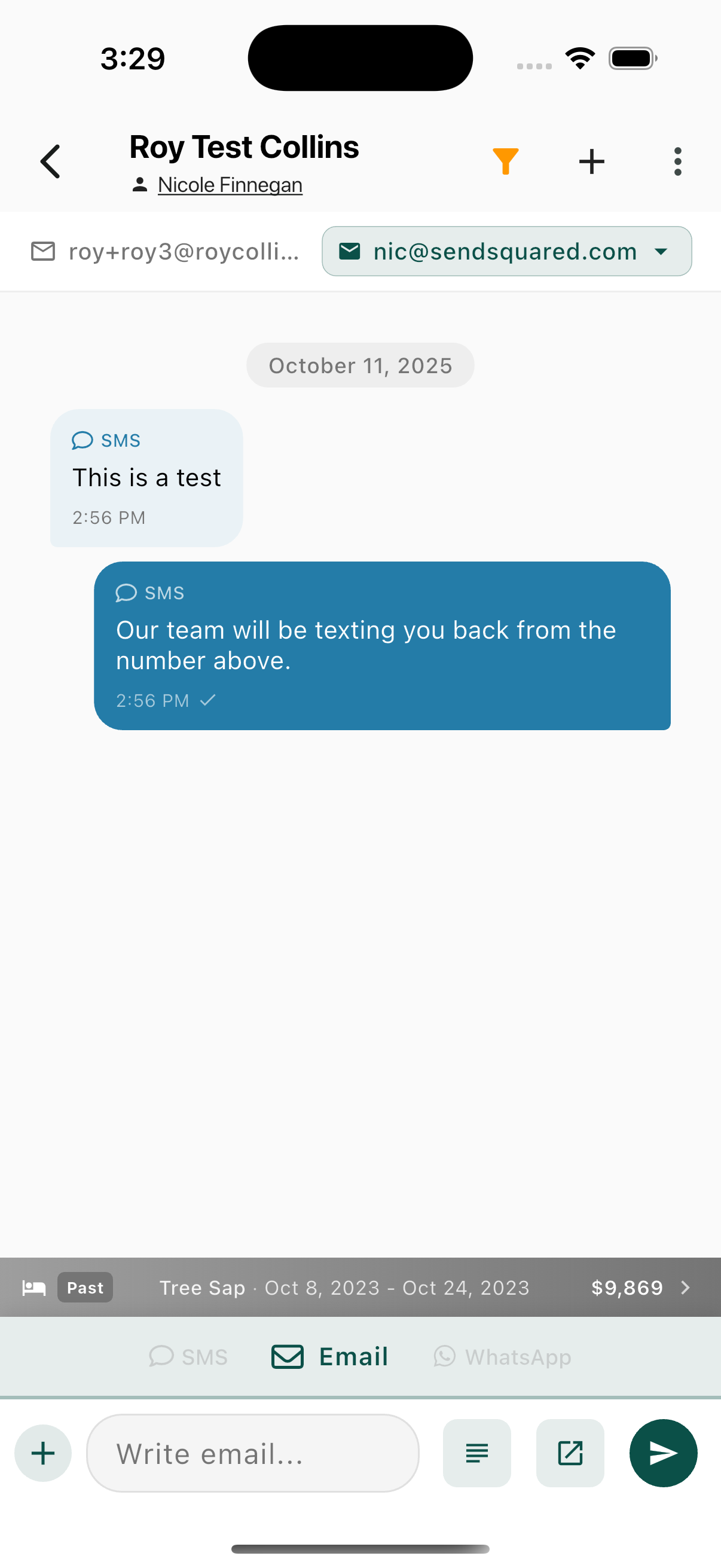 For SMS and WhatsApp, messages send immediately. For Email, you can use templates or the full editor.