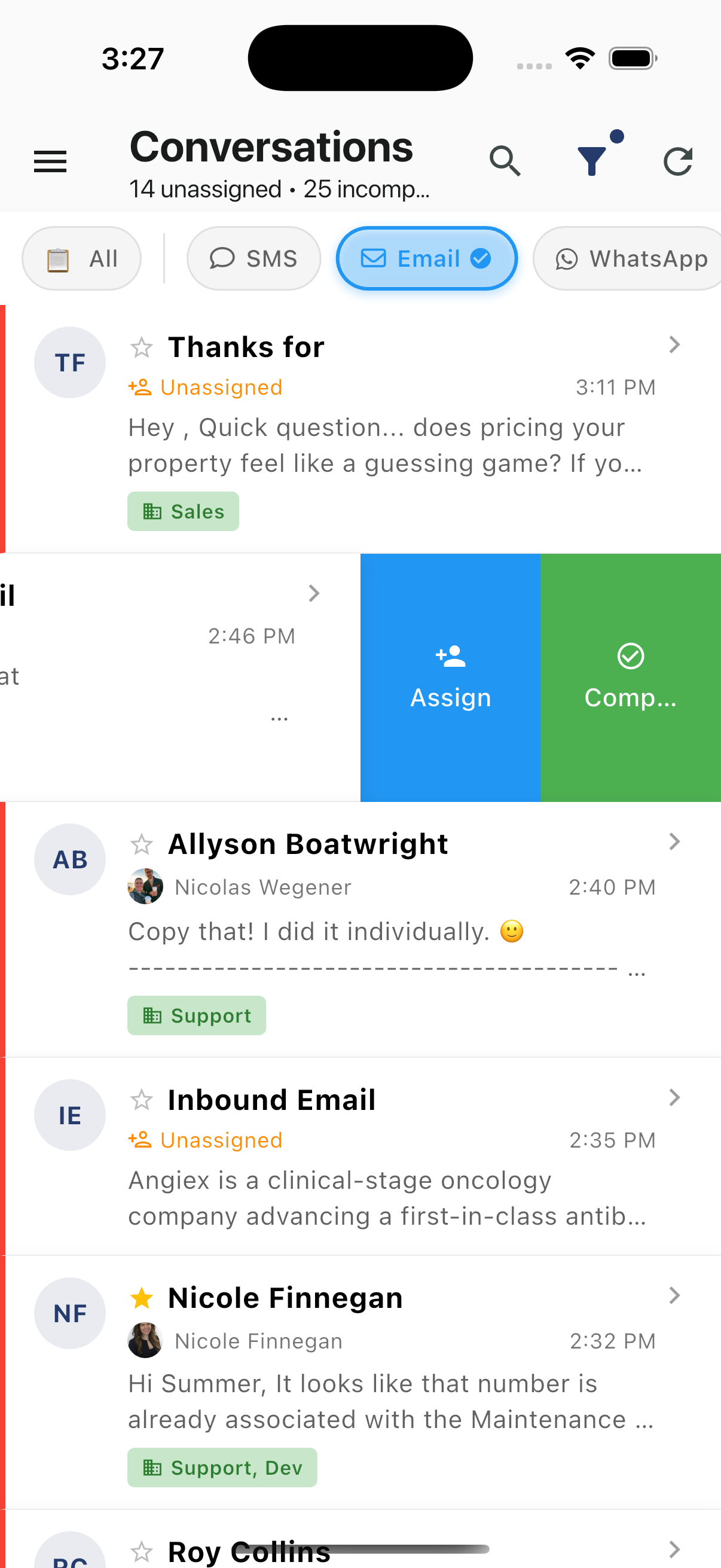 Swipe left on any conversation to reveal the Assign button: