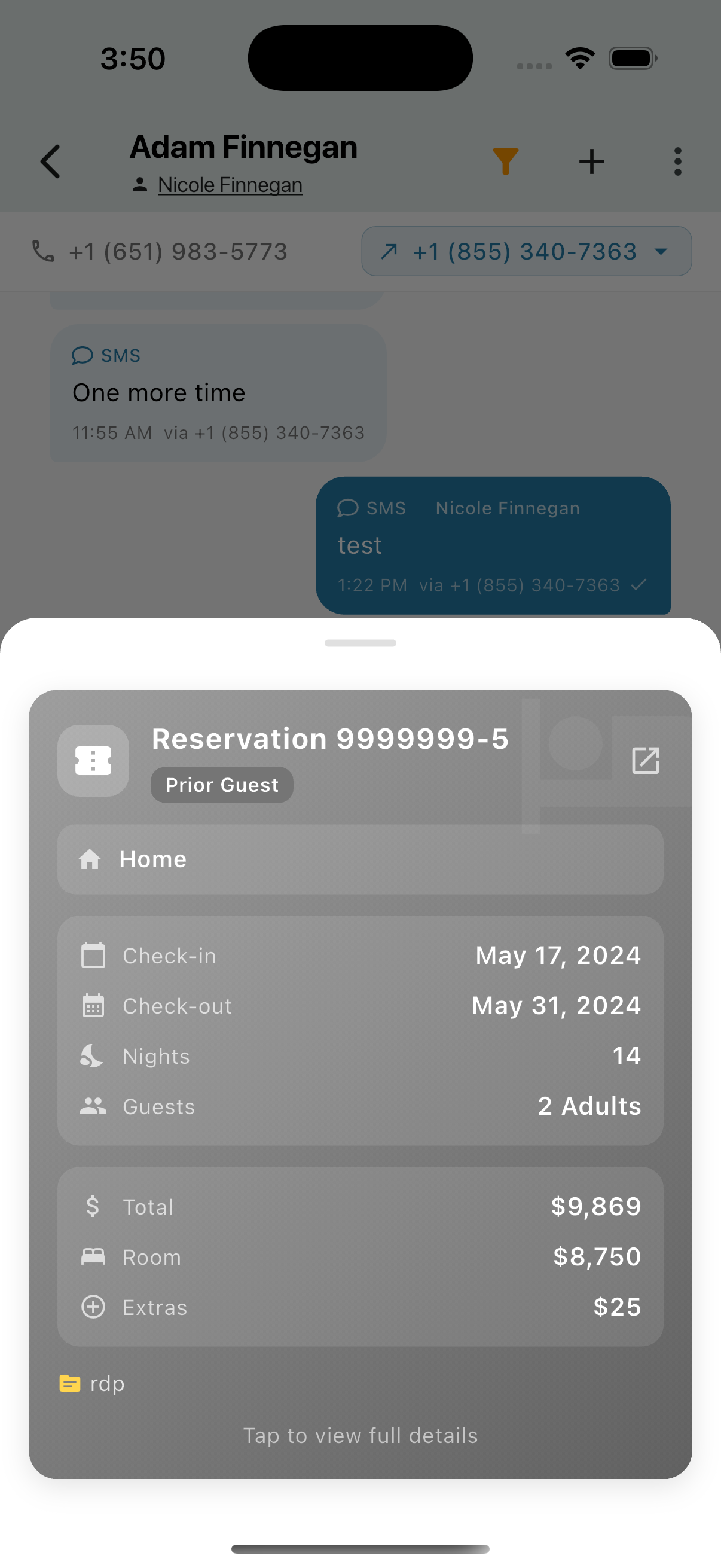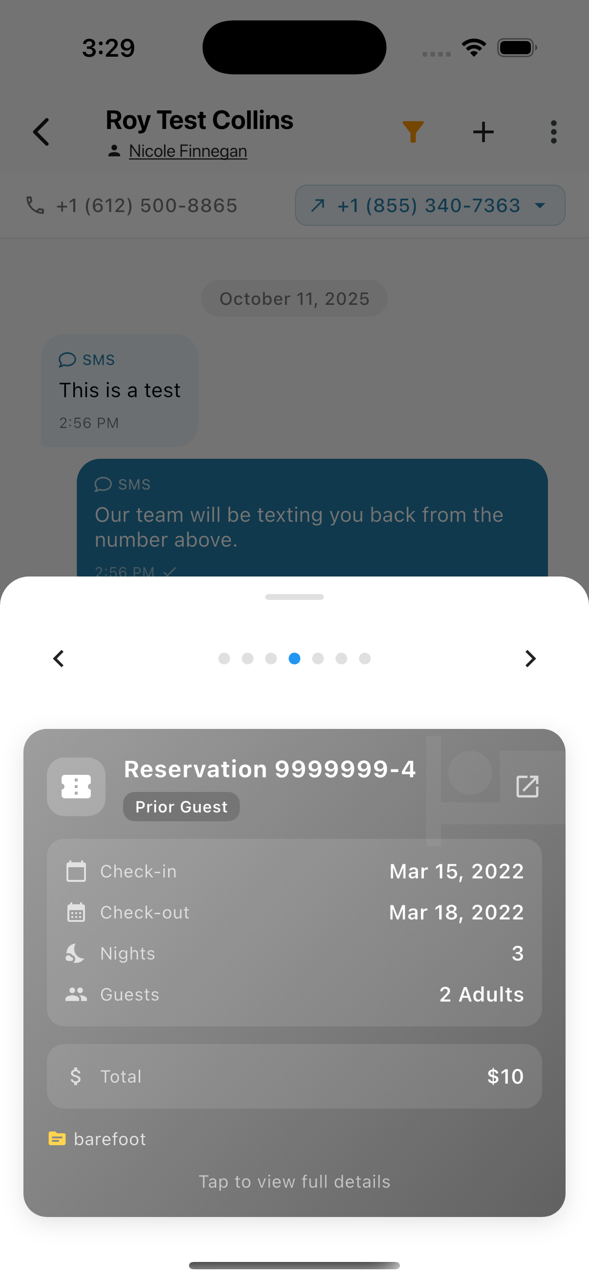 Swipe left/right to view multiple reservations. Tap Tap to view full details to open the full reservation.