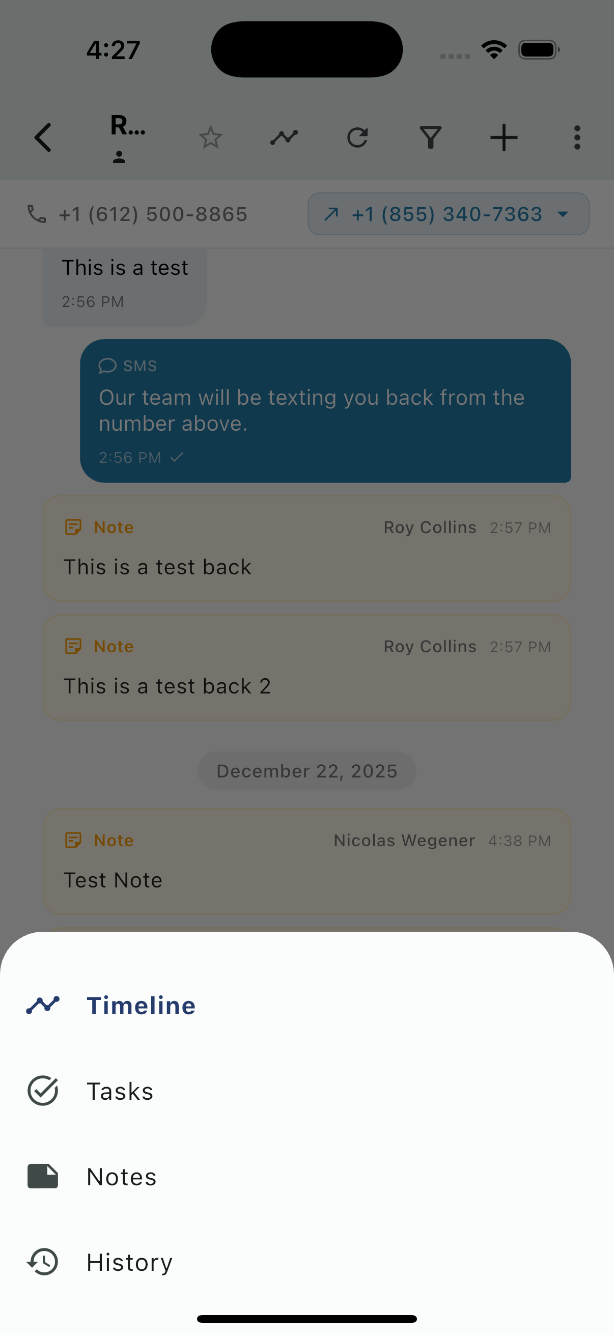 - Notes - Internal notes appear as yellow cards inline with messages