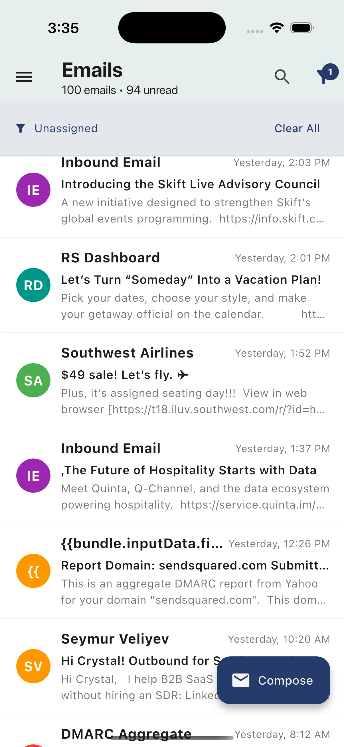 The Emails section provides a dedicated inbox for all email communications. View incoming emails with full HTML rendering, assign them to team members, reply or forward, and manage your email workflow on the go.