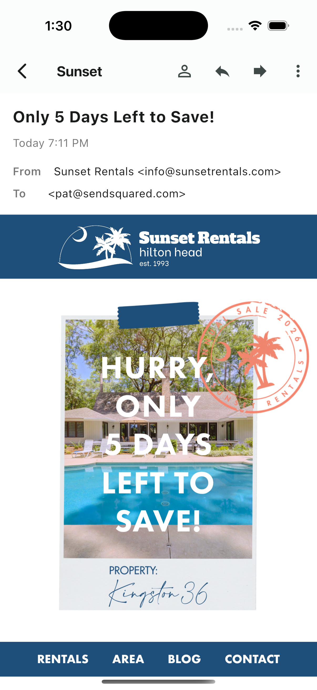 The email body renders the complete HTML email, including images, links, and styled layouts, exactly as it would appear in a standard email client.