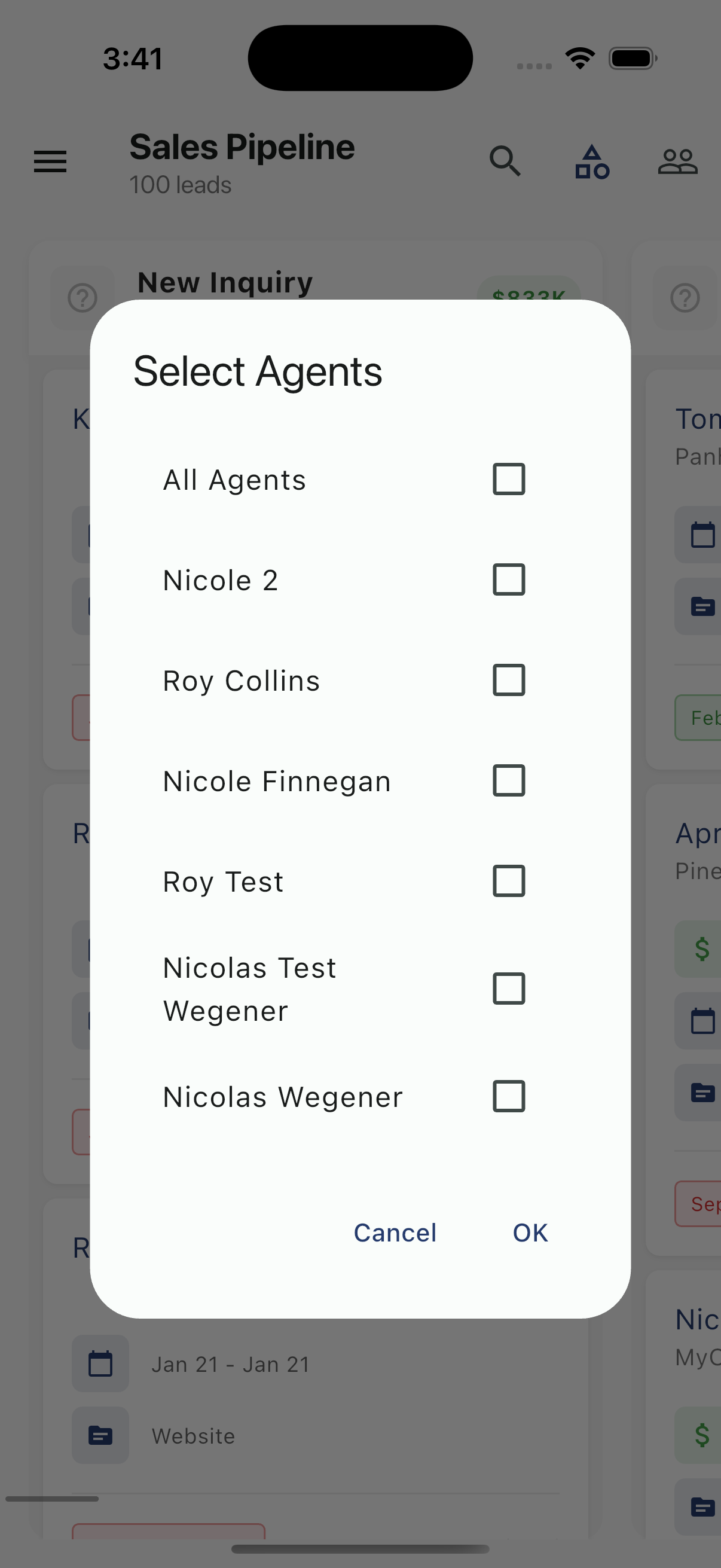 Tap the agents icon to open the Select Agents dialog. Check one or more agents to filter the board to only their assigned leads. Select All Agents to show everything. Tap OK to apply or Cancel to dismiss.