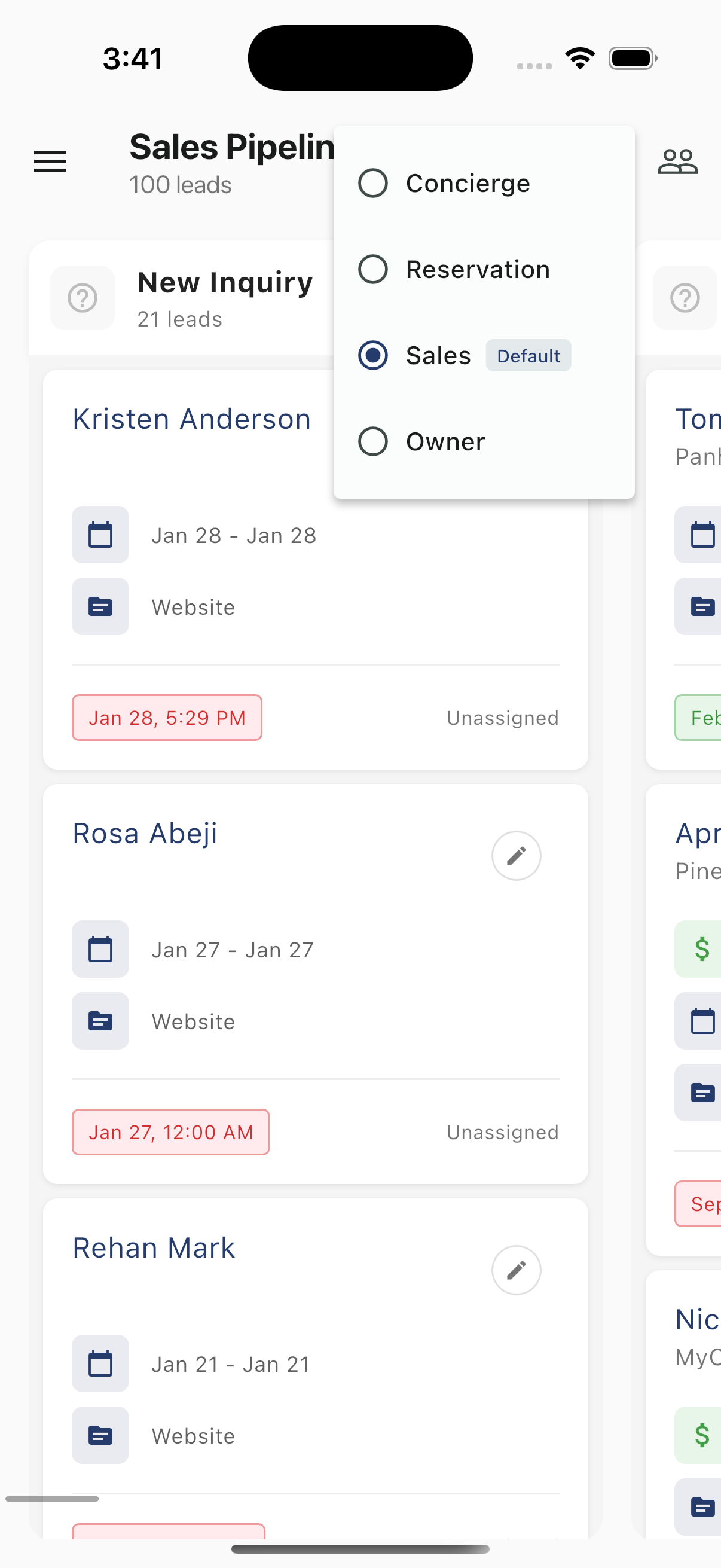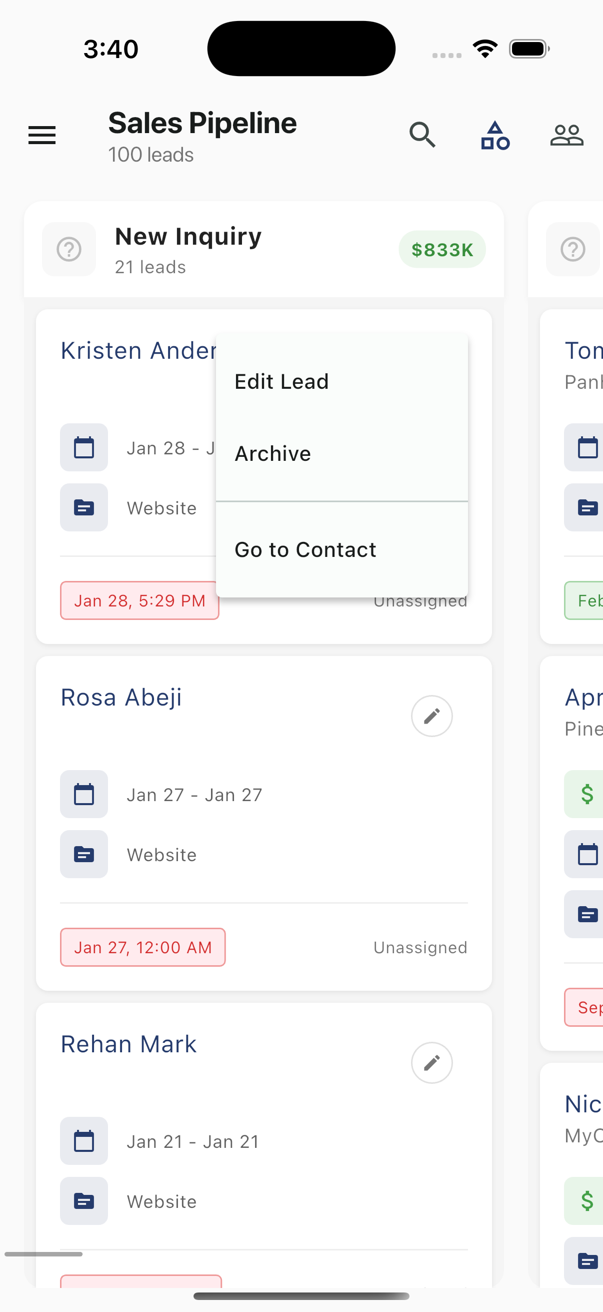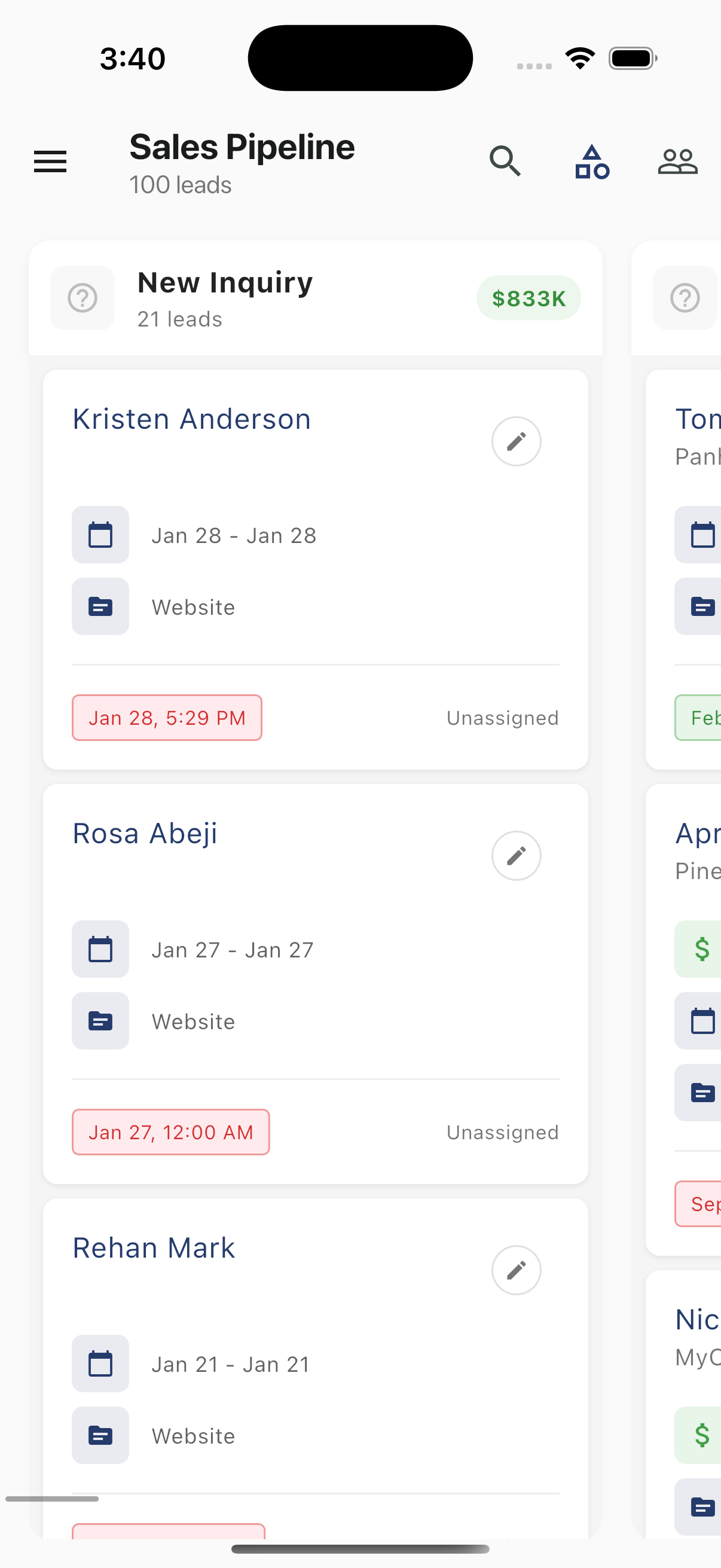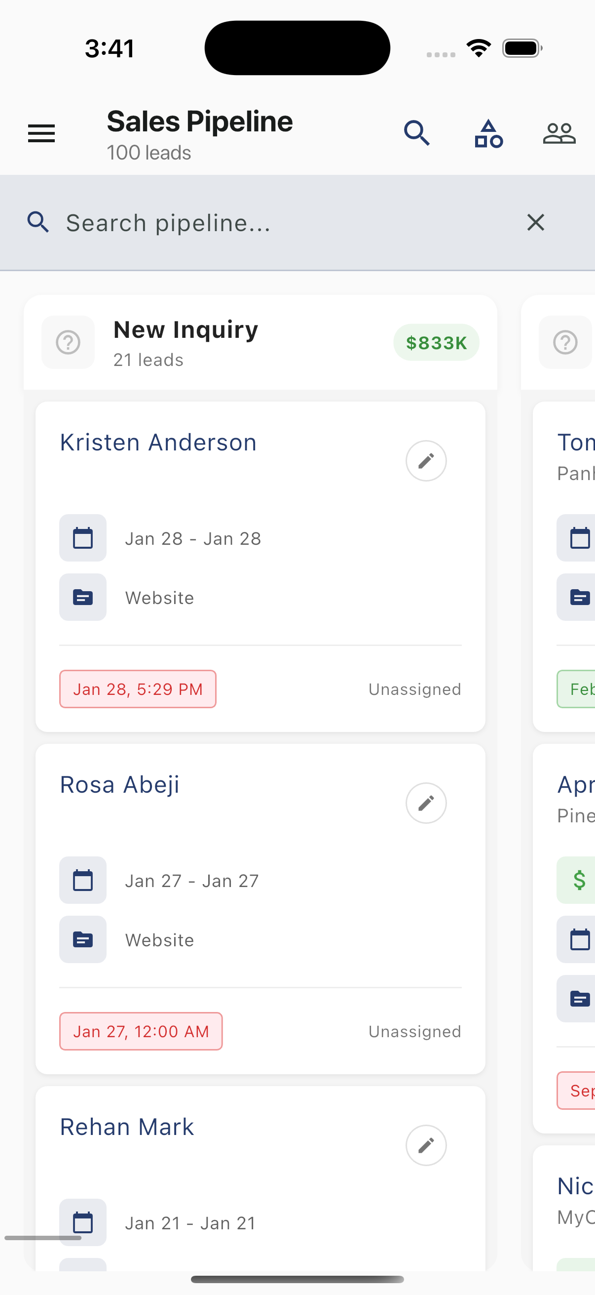 The Pipeline provides a kanban-style board view of your leads, organized by status columns. Swipe horizontally between stages, search leads, filter by agent, and switch between pipeline types — all from the mobile app.