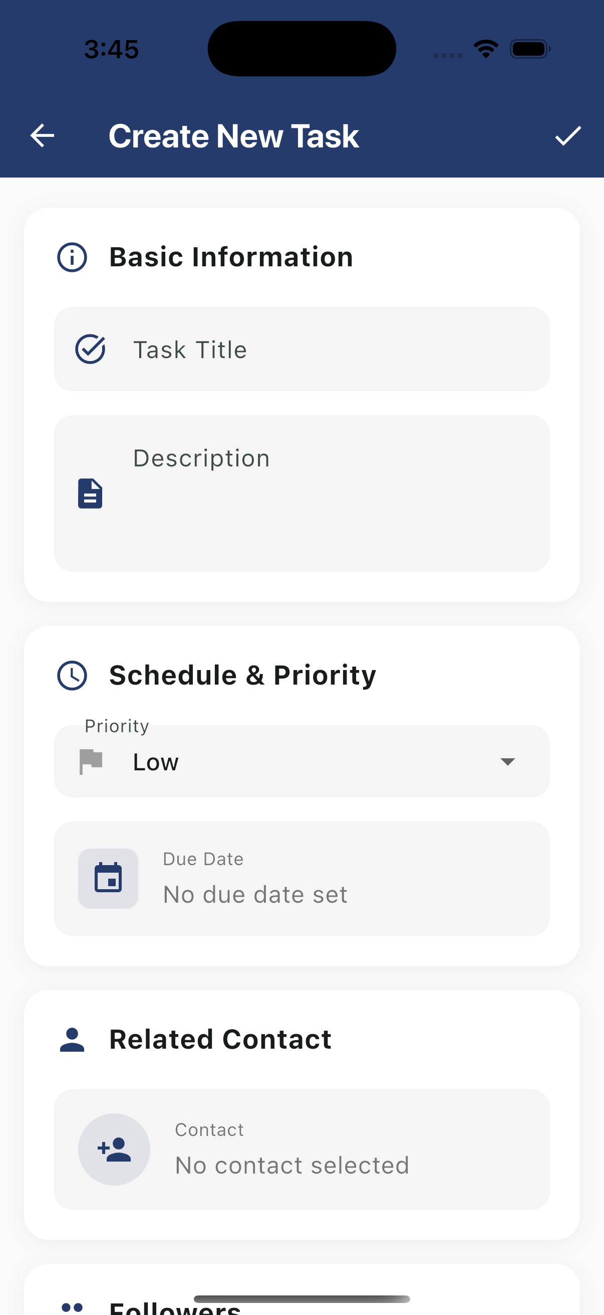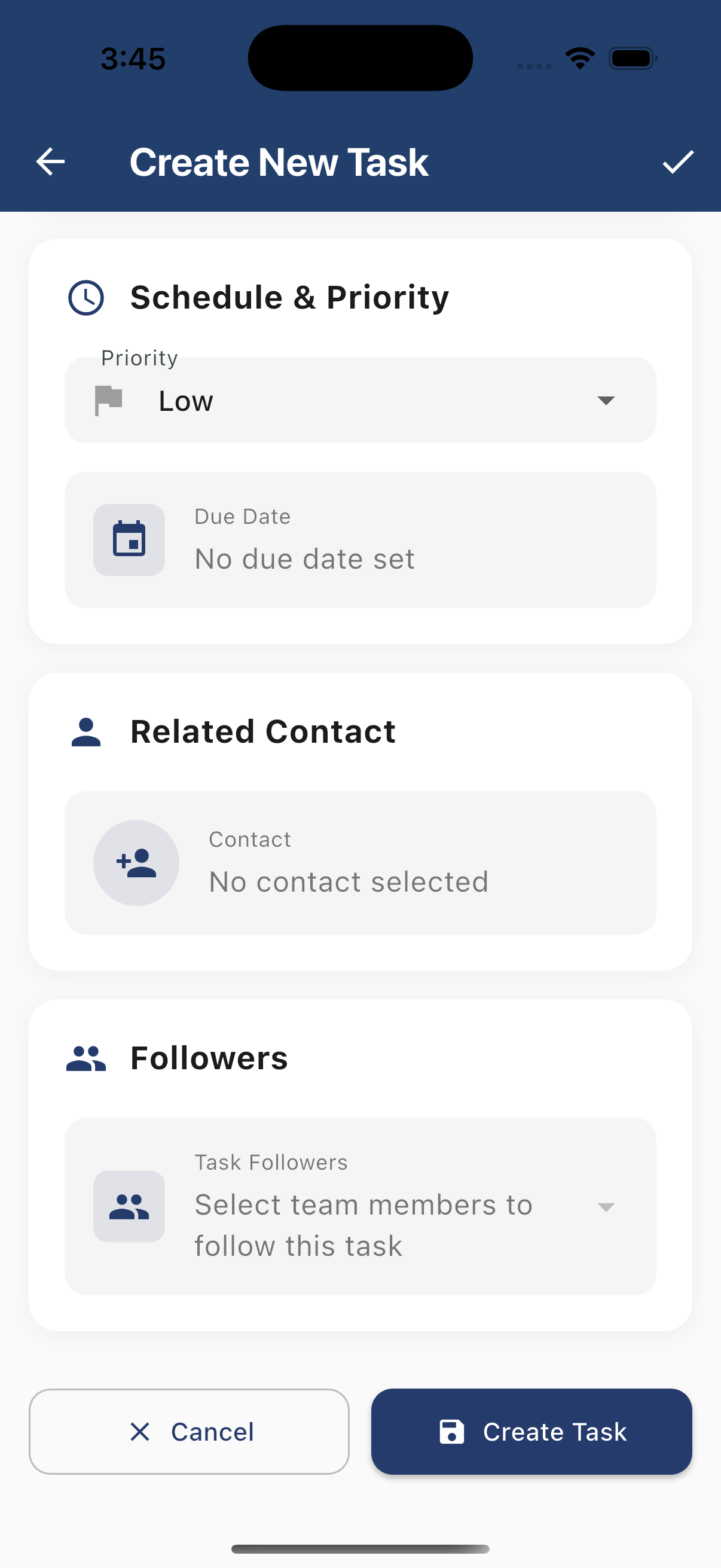 Create tasks to track follow-ups, reminders, and to-dos. Tasks can be standalone or linked to specific contacts and leads.